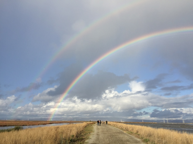 Prompt: Why are these two people walking at the mud flats? What does each want from the other? Describe the tension between them using a metaphor stirred by the photo. Who is the third person? Which of the three misses the rainbow? Why? Set the timer for 10 minutes. Go!