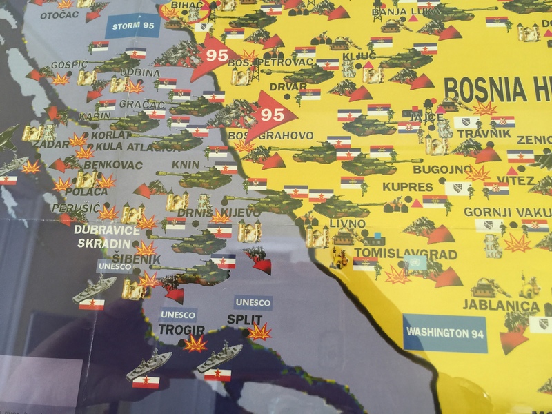 Prompt: This photo was taken from a public wall of The War Crimes Office in Tuzla, Bosnia. It shows a CIA map from the mid-1990s. Use the troop movements to craft a bicultural war story.